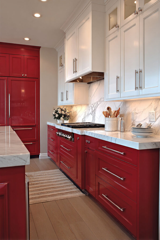 This combination gives you the energy of red without overwhelming, while white prevents any heaviness. It’s bold enough to make a statement but balanced enough to live with long-term. Consider adding a butcher block rolling kitchen cart for a touch of warmth and extra practicality.