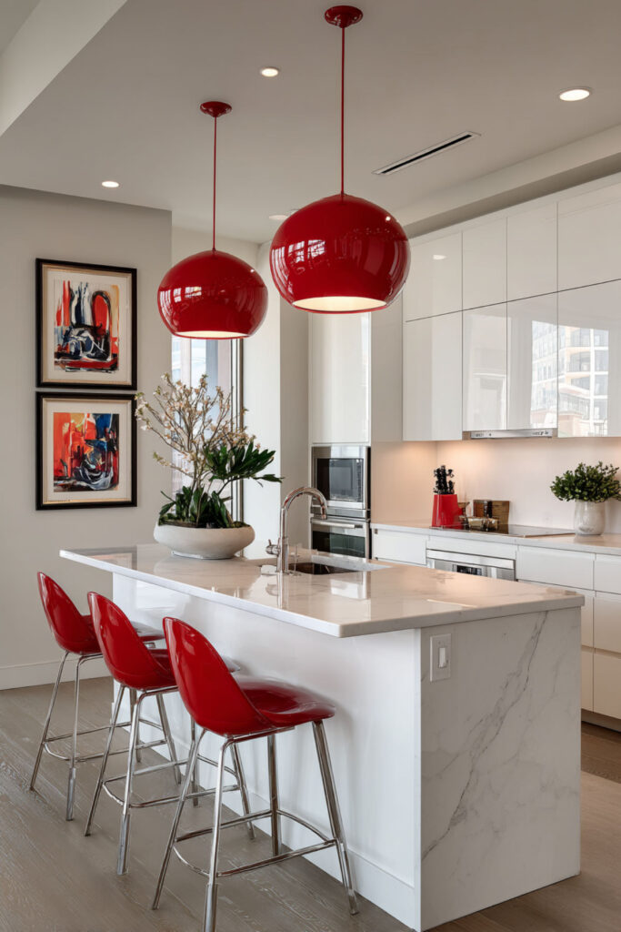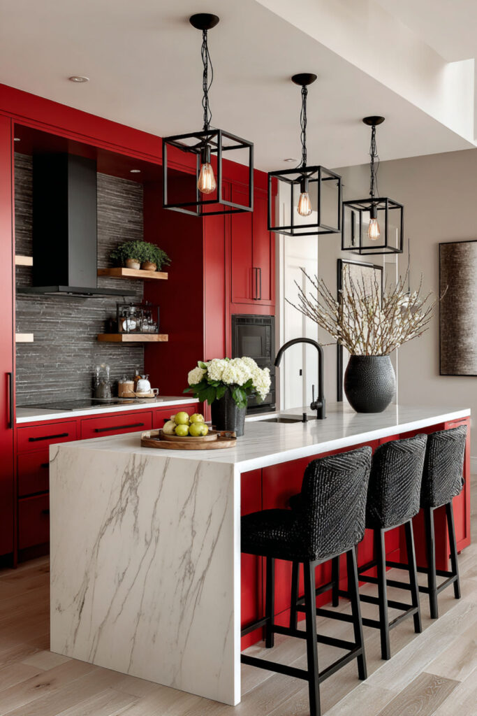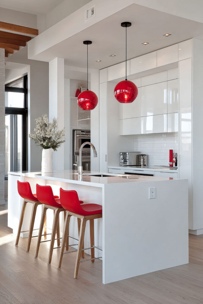 Starting with a white kitchen and adding red through accessories, backsplash, or a single statement piece lets you control the boldness level. Red bar stools, a red range hood, or even just red small appliances against white creates controlled drama.