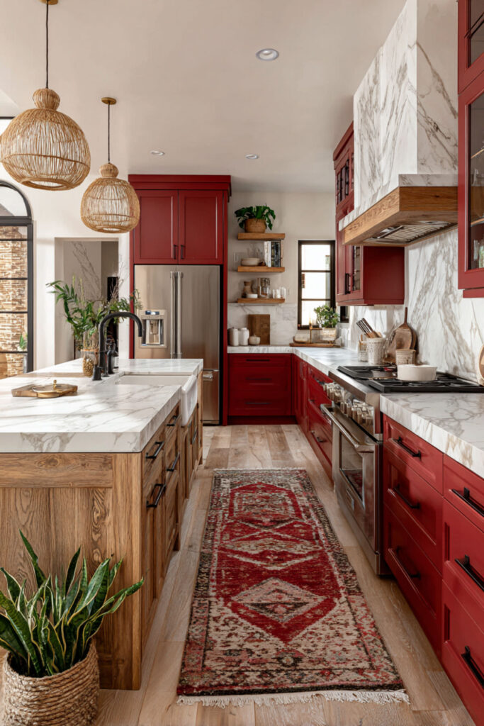 Combining red with natural wood and white creates this perfect balance of bold and organic. The wood warms up the red-white combination, preventing it from feeling too stark or commercial. Think red cabinets with butcher block counters and white walls.