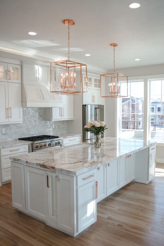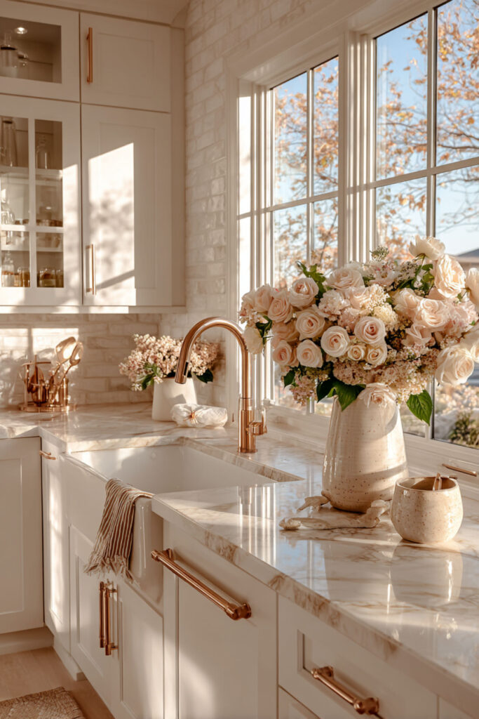 All-white kitchens with rose gold accents throughout—hardware, lighting, faucet, accessories—creates this fresh, sophisticated palette that feels both trendy and timeless. The white keeps rose gold from overwhelming while rose gold prevents white from feeling sterile.