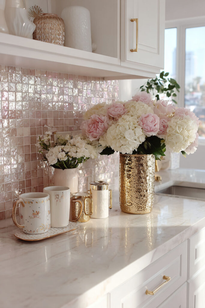 A rose gold or copper-toned backsplash brings warmth and glamour without the commitment of rose gold appliances. Think metallic tiles, rose gold grout with white tiles, or even rose gold mirror tiles for maximum drama. The vertical surface catches light beautifully.