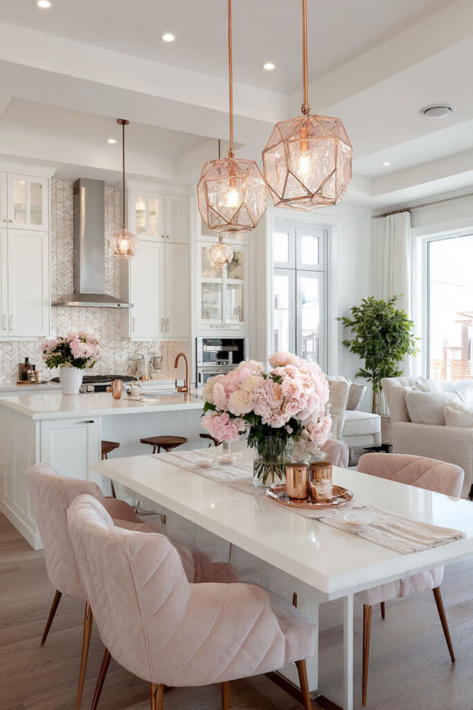 Extend rose gold into adjacent dining areas through light fixtures, bar carts, or serving pieces to create flow between spaces. This creates a cohesive metallic story throughout your entertaining areas. The consistency makes spaces feel larger and more intentional.