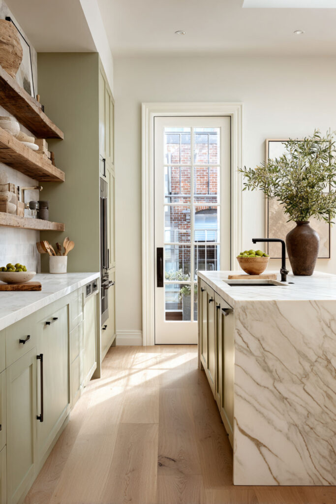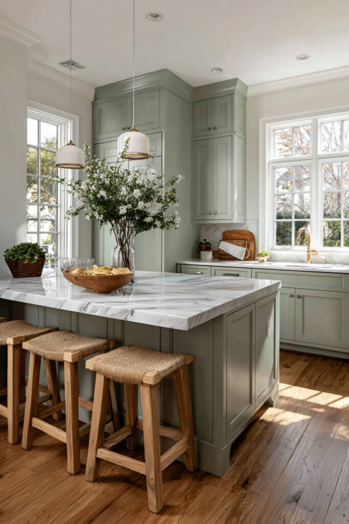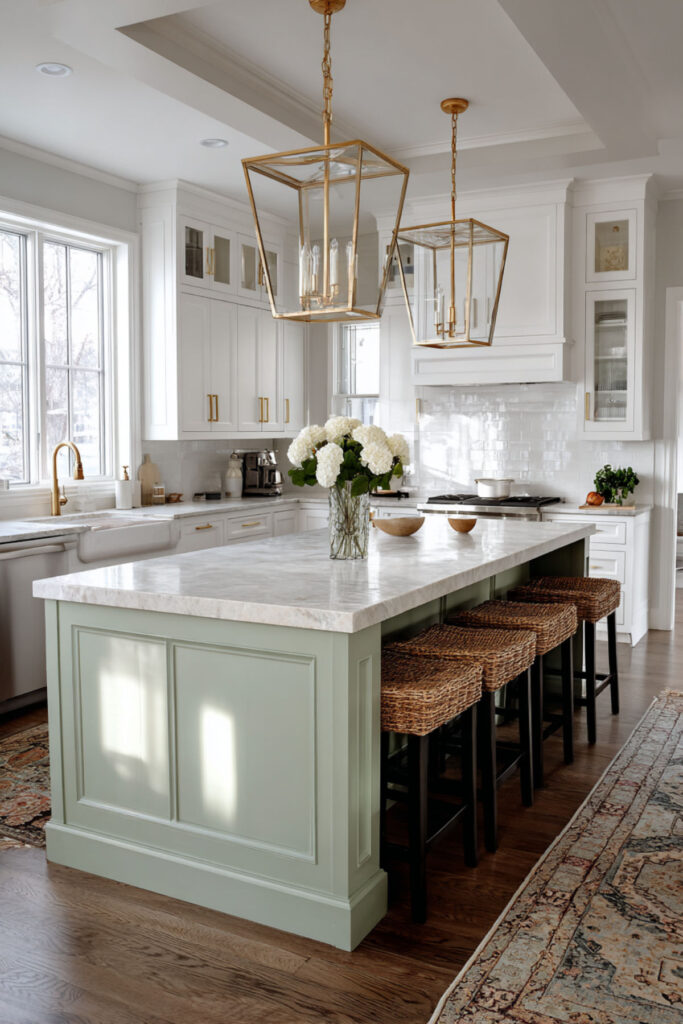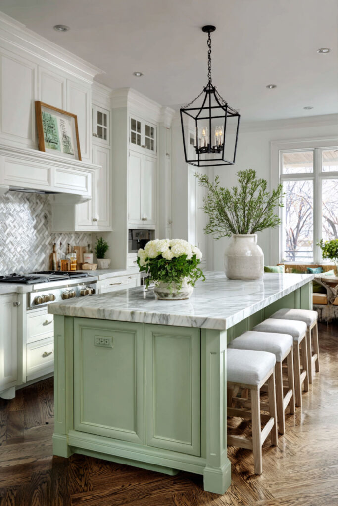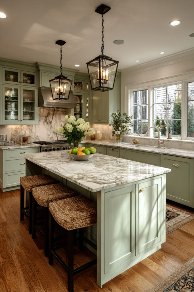 Sage Green and Marble Kitchen Island for a Luxe Touch