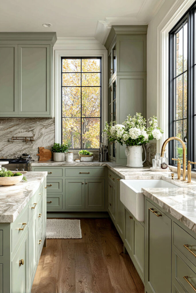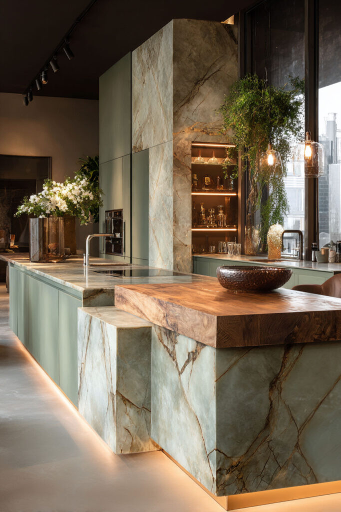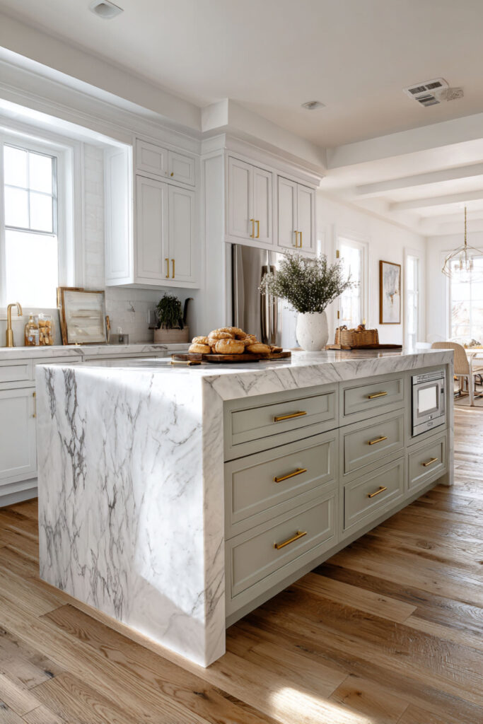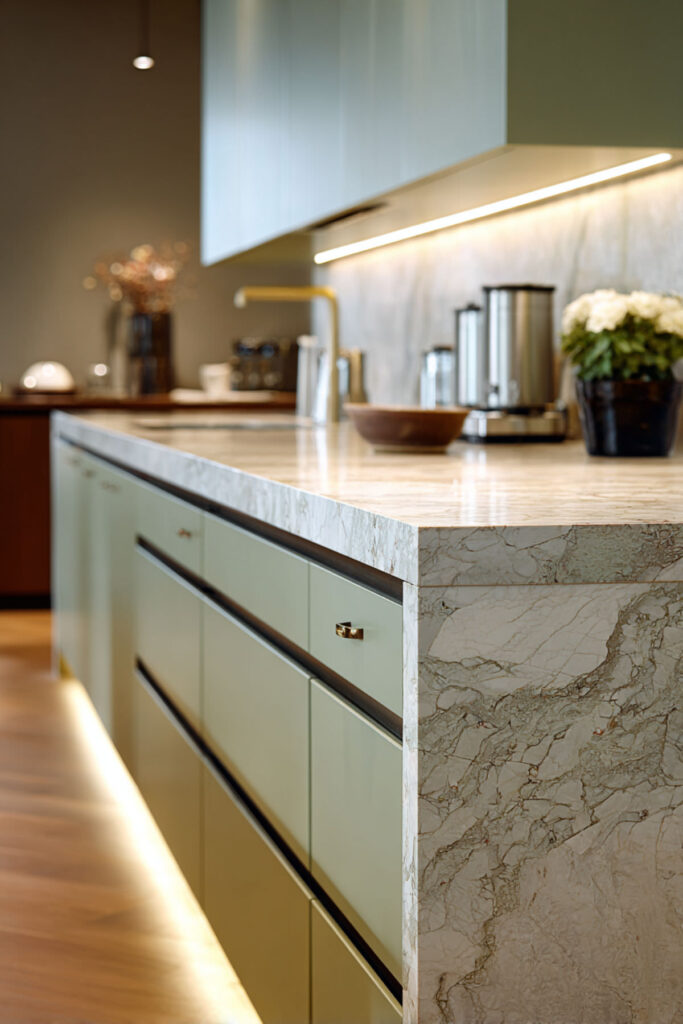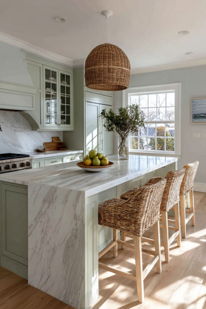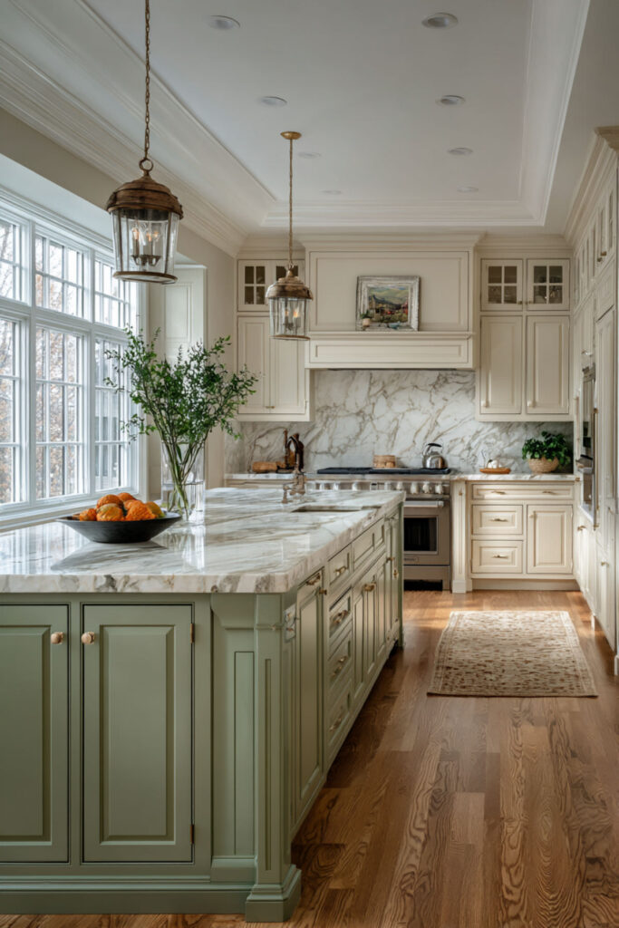 Sage Green and Marble Kitchen Island for a Luxe Touch