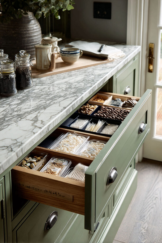 Storage is the unsung hero of any island that actually works for a family. A sage green kitchen island with deep, built-in storage drawers on one side gives you a dedicated spot for snack supplies — granola bars, fruit pouches, crackers, reusable bags — right where the kids can reach them. No more rummaging through the pantry. No more “Mom, where are the goldfish?” I recommend deep, soft-close drawers with interior dividers. Organize them by snack type: one section for salty, one for sweet, one for fresh. It sounds simple, but when it’s 4 PM and everyone’s hungry, that organizational system pays for itself. The sage green on the outside keeps it all looking calm while the inside is doing the real work.