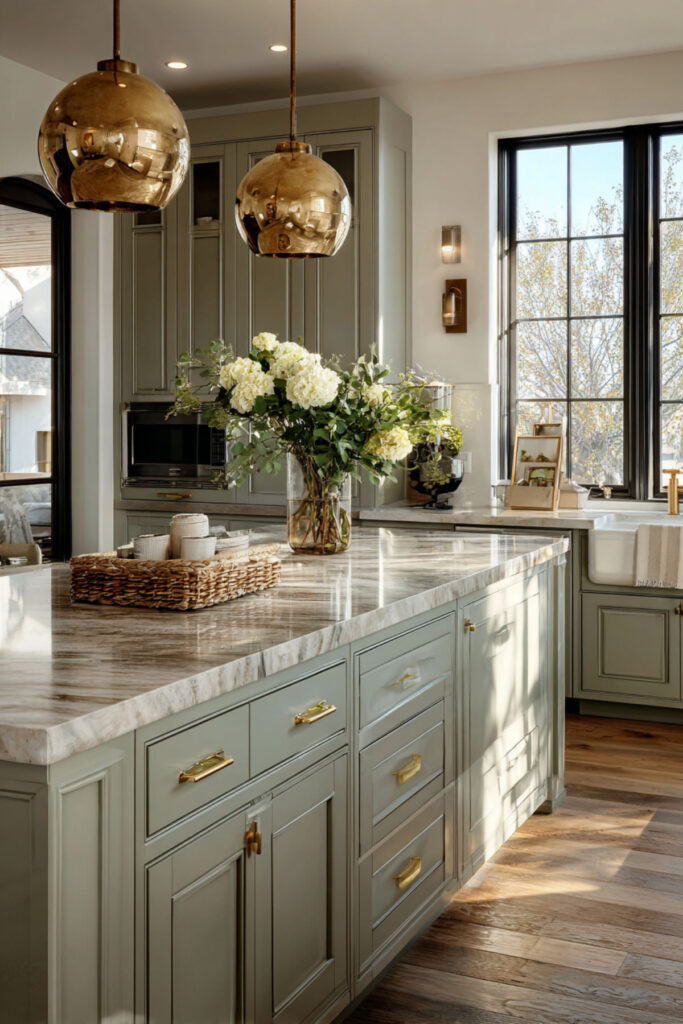 Sage Green and Gold Kitchen Island for Warm Elegance