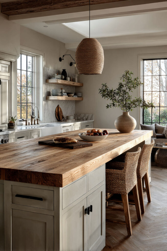 For the mom who craves simplicity, a natural airy kitchen with a sage green island paired with light wood — oak shelving, oak bar stools, an oak ceiling beam — creates the most calming version of this palette. The sage green island sits at the center, grounded and beautiful, while the light wood and white surfaces around it keep everything feeling open and breathable. No clutter, no visual noise, just a clean kitchen that works. I recommend light oak counter stools with a simple spindle back — they’re comfortable, easy to wipe down, and they look gorgeous against sage green. A linen pendant light overhead and a few small potted herbs on the counter complete the look. This timeless kitchen design approach makes the hectic parts of motherhood feel a little more manageable just by walking into the room.