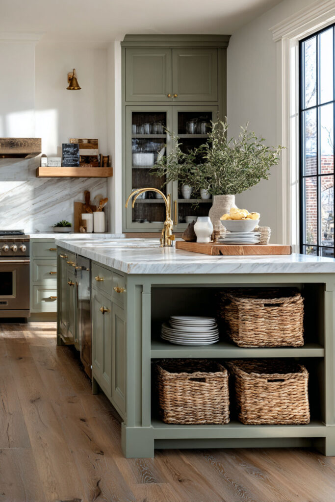 A farmhouse sage green kitchen island leans into that comfortable, homey aesthetic that makes a kitchen feel like the heart of the house. Think an island with shaker panels, a decorative apron on the front face, turned legs or corbels at the corners, and maybe a few open niches for baskets. The sage green softens the farmhouse details and keeps it from looking too themed or country. I recommend turned legs at the two front corners — they make the island look more like furniture and less like a cabinet, which gives the kitchen character. Add a few wicker baskets in the open niches for kid snacks and produce, and the island becomes both a design feature and a functional hub. This green farmhouse kitchen design approach works for anyone who wants charm with purpose.