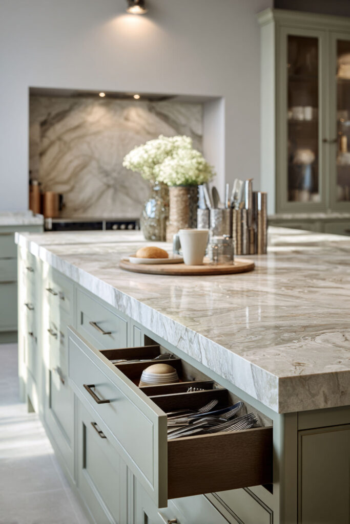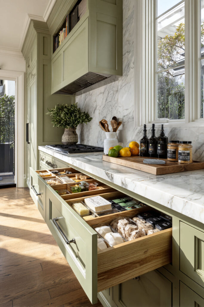 The internal layout of your island matters just as much as the exterior color. A sage green island with thoughtful kitchen island cabinets layout — pull-out drawers, lazy Susans, tray dividers, even a pull-out trash bin — means everything has a home. No more mystery junk drawers. No more digging through stacked pots to find a cutting board. The right pull-outs turn the island into the most organized spot in the whole kitchen. I recommend at least one pull-out drawer with adjustable dividers for snack organization, one deep pot drawer, and a tray divider section for cutting boards and baking sheets. When the inside of your island is as organized as the outside is pretty, daily life runs smoother — and that’s what functional design is actually about.