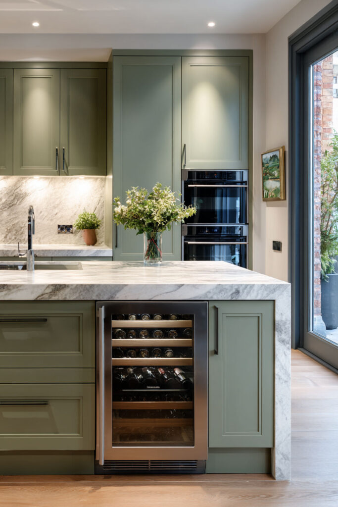 Marble and sage green is one of those pairings that was simply meant to be. A sage green and marble kitchen island — sage on the base, marble on the top — creates this quiet luxury that makes the island feel like a proper piece of furniture, not just a cabinet with a counter. The cool grey veining in the marble picks up the grey undertones in the sage, and the combination reads as timeless and elegant. I recommend a honed Carrara or Calacatta marble top for the island. Honed finishes feel more relaxed and forgiving than polished — a real plus when the island doubles as a snack station. Even etching from lemon juice or vinegar blends into the matte surface over time, which makes it more family-friendly than it sounds.