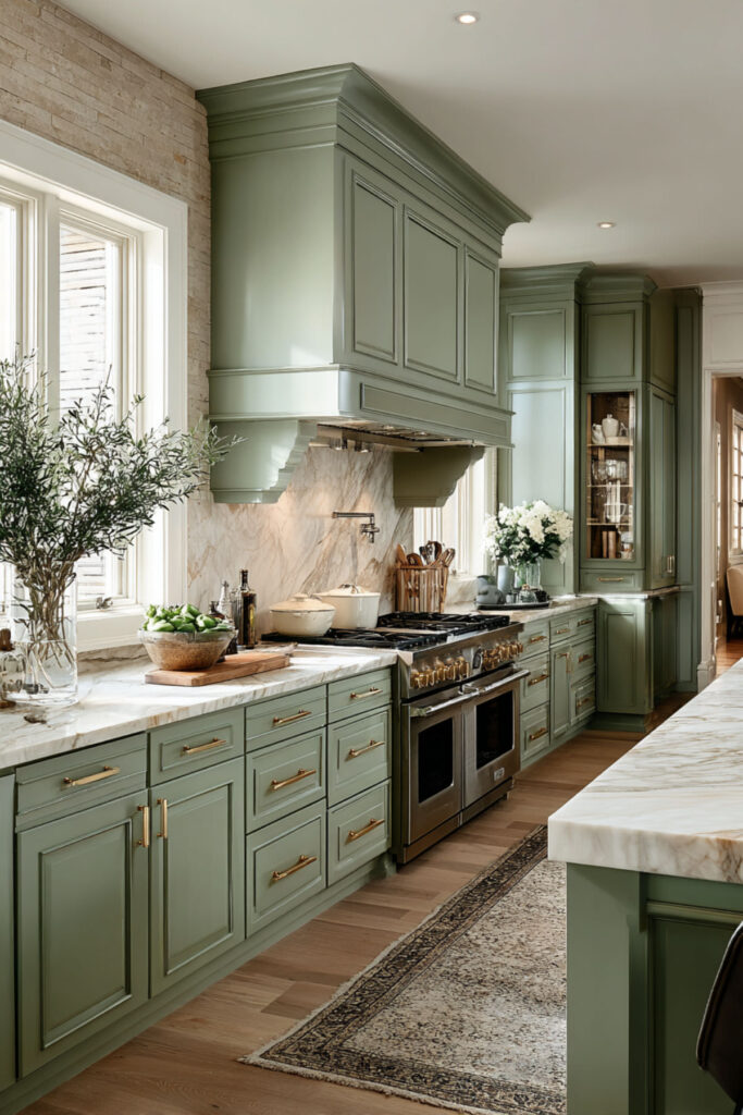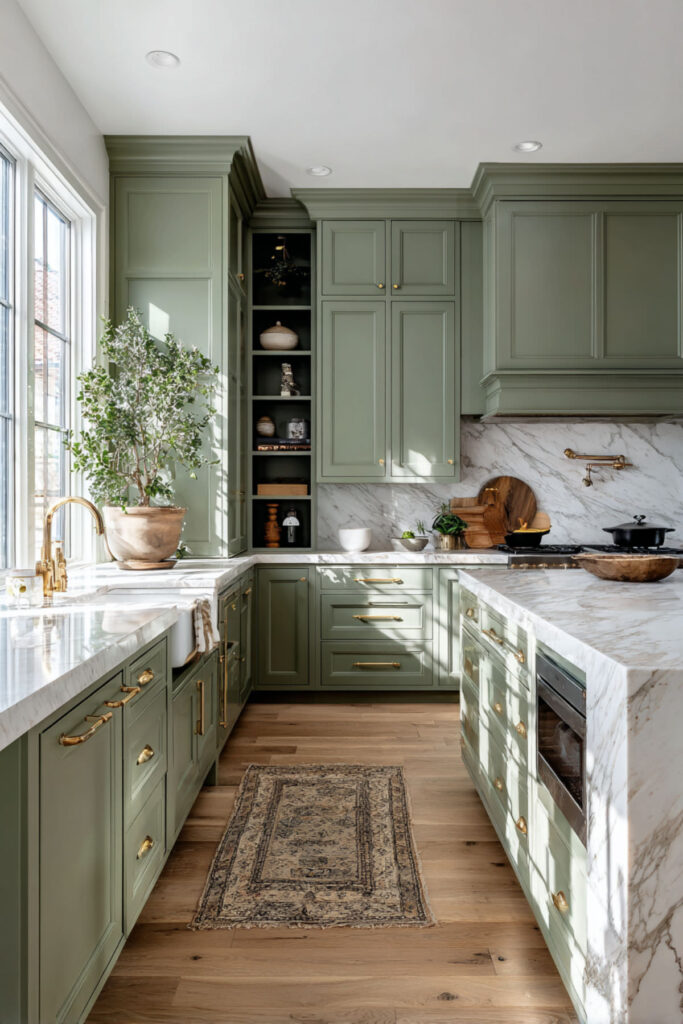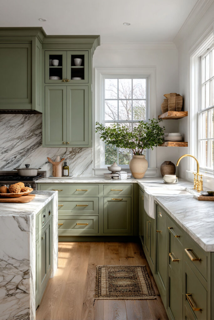 And for the woman who’s ready to go all in — this is the full vision. Sage green cabinets everywhere. Marble countertops, marble backsplash, maybe even a marble shelf or two. Brass hardware and fixtures connecting it all. Warm wood flooring to ground the coolness of the stone. Nothing extra. Nothing competing. Just sage and marble and light, working together in total, quiet harmony.