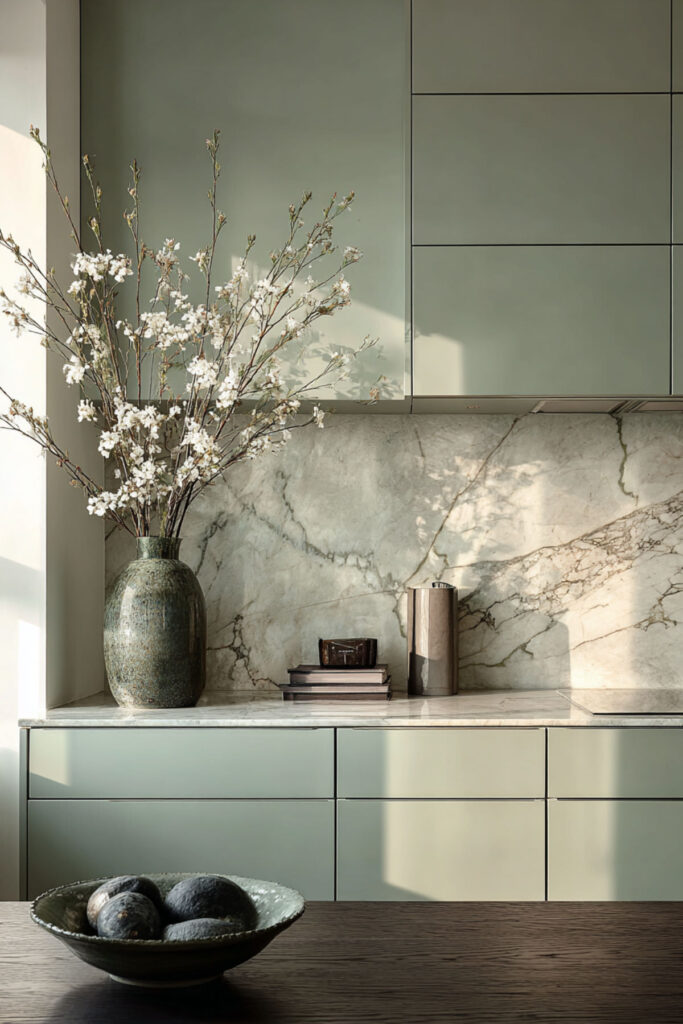 Sage green in a modern kitchen — flat-front cabinets, clean lines, minimal hardware — paired with a single, stunning marble island creates one of the most refined spaces on this list. The minimalism of the cabinetry lets the marble be the focal point, and the sage brings enough warmth and color to keep the room from feeling austere. It’s modern without being cold, which is the hardest balance to strike.