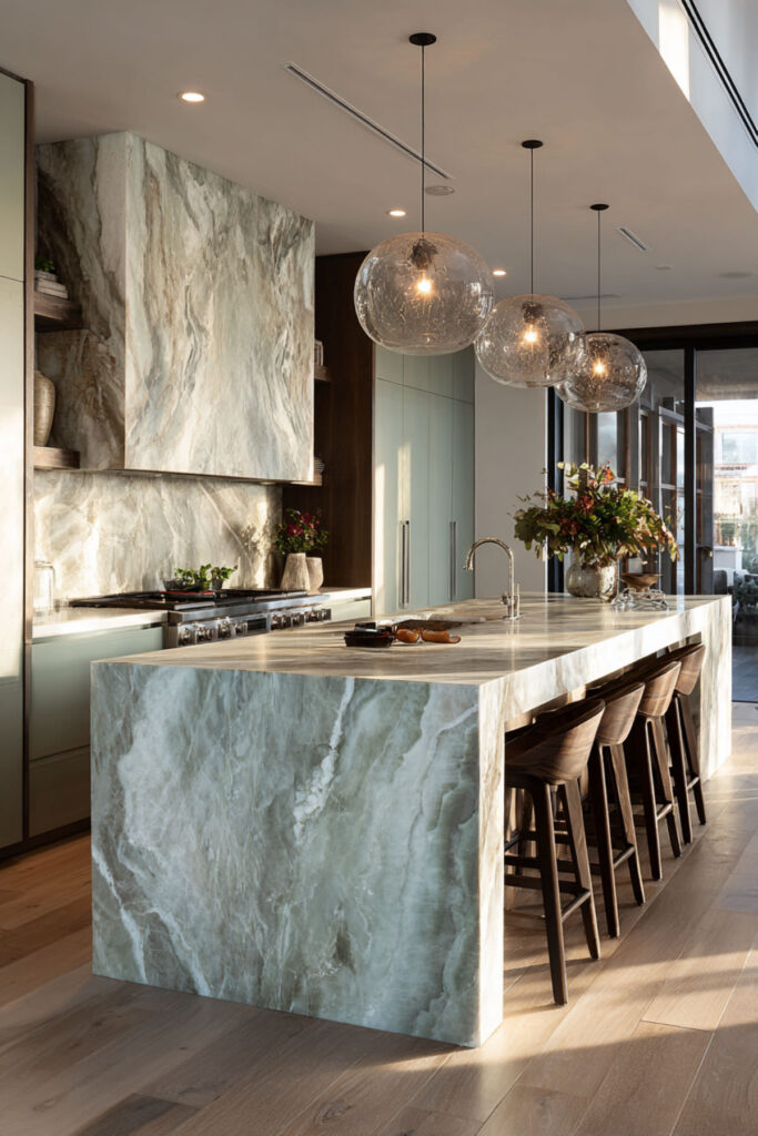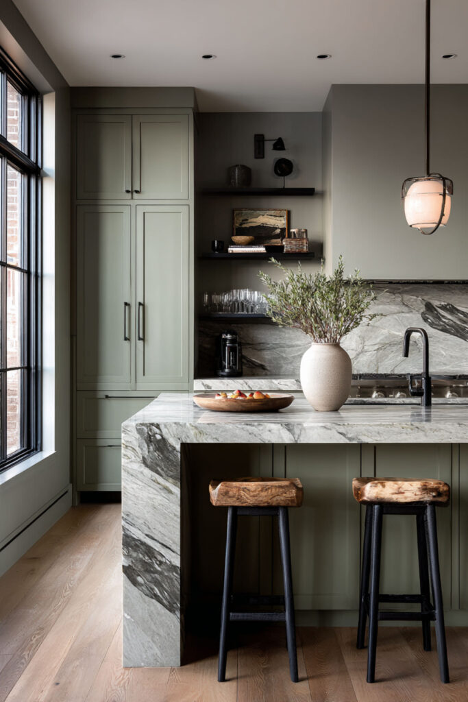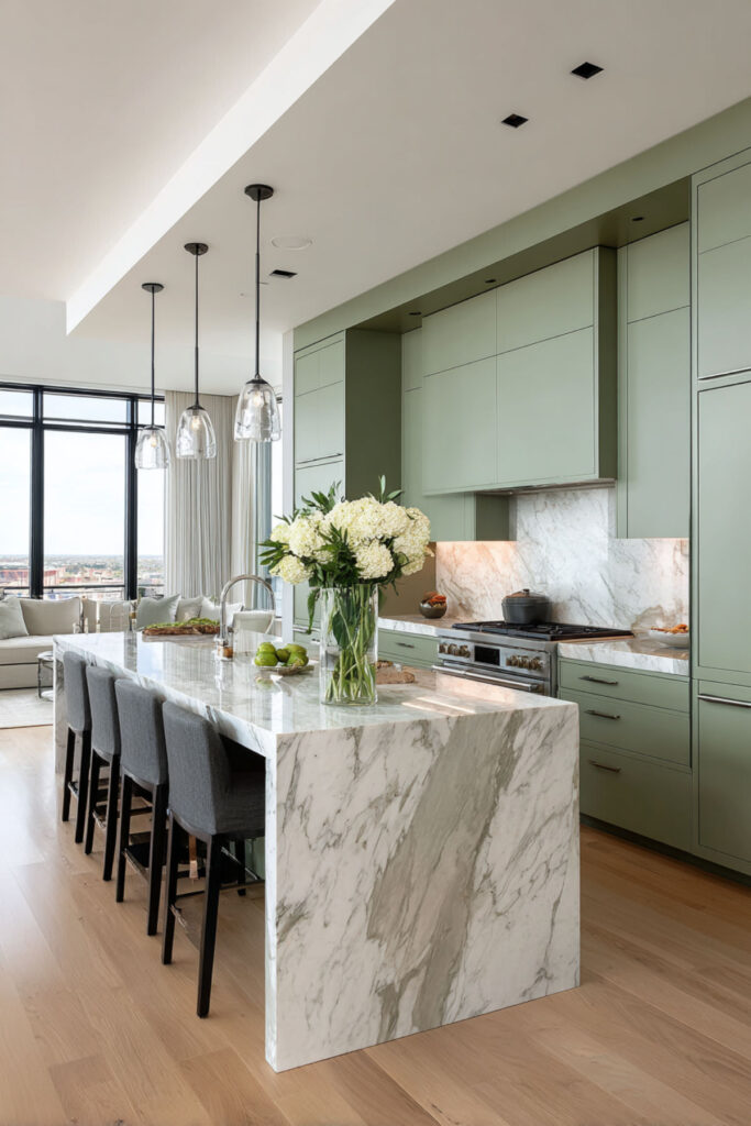 I recommend a sage green painted island with a thick Calacatta marble top and matching waterfall edges on both sides. The marble wrapping down gives the island a monumental, gallery-like quality, while the sage base keeps it warm and approachable. Cream or white perimeter cabinets let the island be the star. It’s green cabinets marble countertop taken to its most elevated form — and it looks absolutely incredible in person.