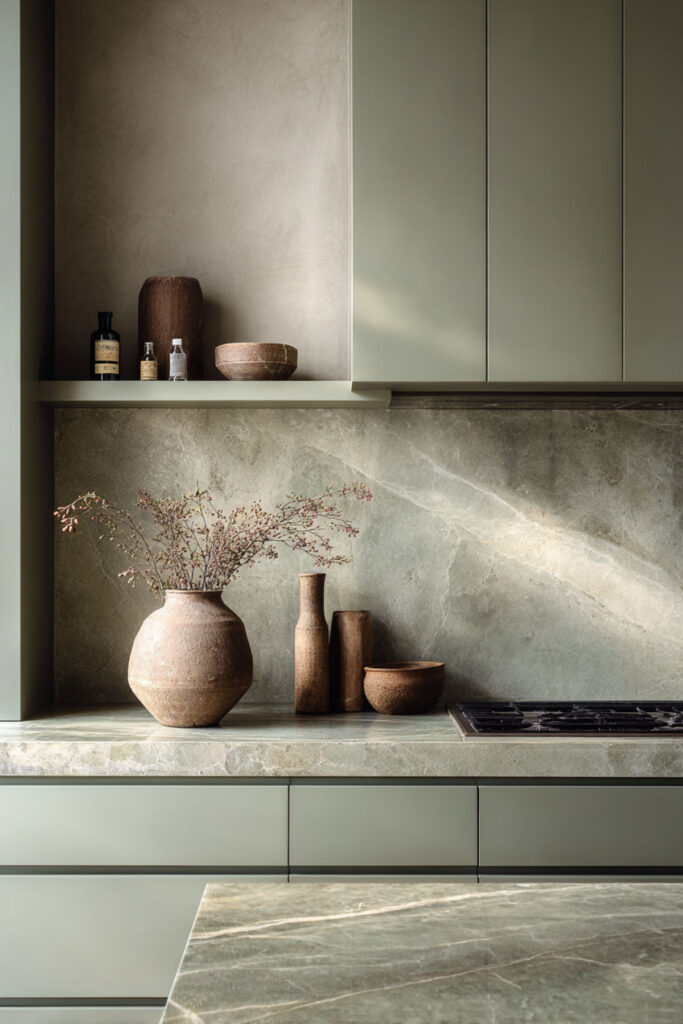 I recommend honed marble countertops and a honed marble backsplash in a soft white or cream base with sage green cabinets. The matte finish absorbs light softly instead of reflecting it sharply, which gives the whole kitchen a gentler, more serene quality. It’s a soft sage kitchen that truly lives up to the word “sanctuary.” You actually want to lean against the counter and stay awhile.