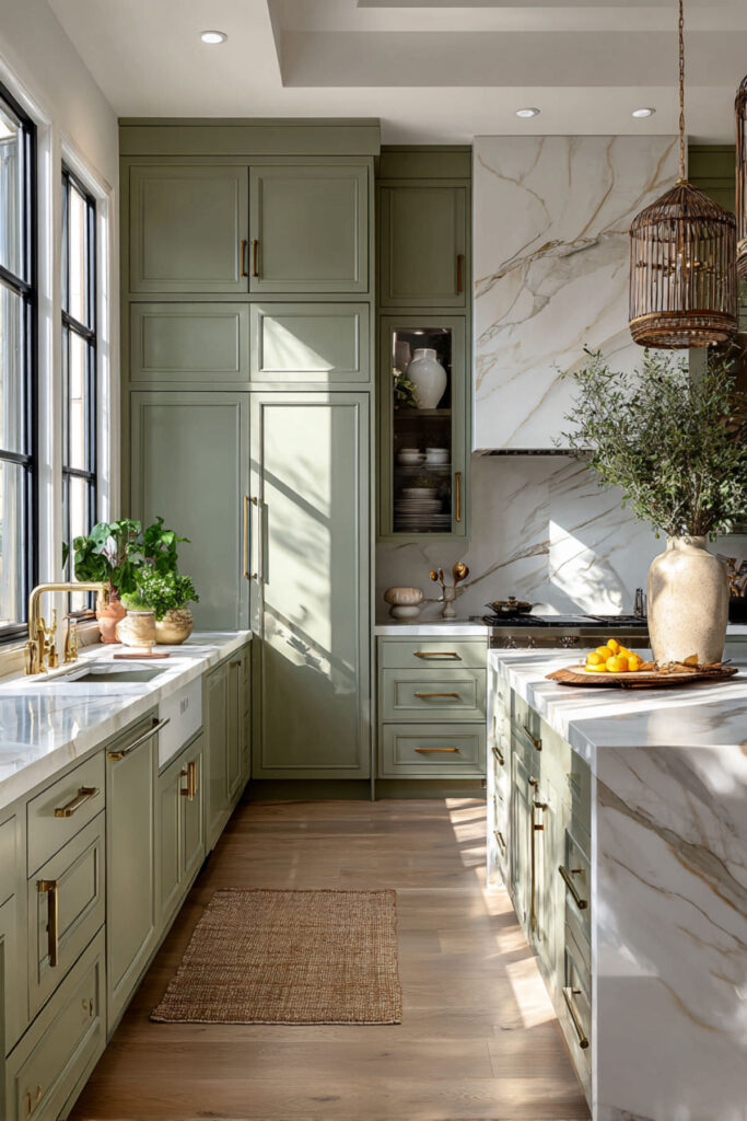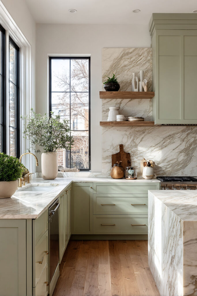 That’s the effect of sage green and marble together. Sage brings calm — it’s a color that literally slows you down, connecting you to nature without even trying. And marble brings a cool, polished elegance that no other surface material can replicate. The veining moves. The surface feels alive. Together, sage and marble create a kitchen that feels like a sanctuary — a word I don’t use lightly, but in this case, it fits. This is a space designed for slowing down, for making the everyday feel beautiful, for turning chopping onions into something that genuinely feels good.