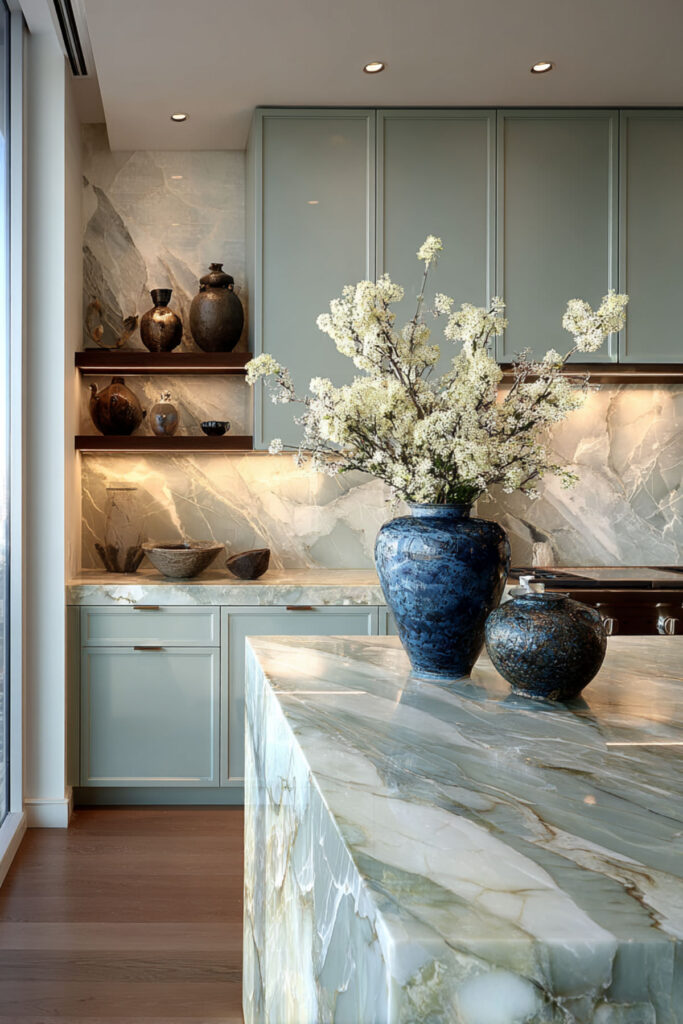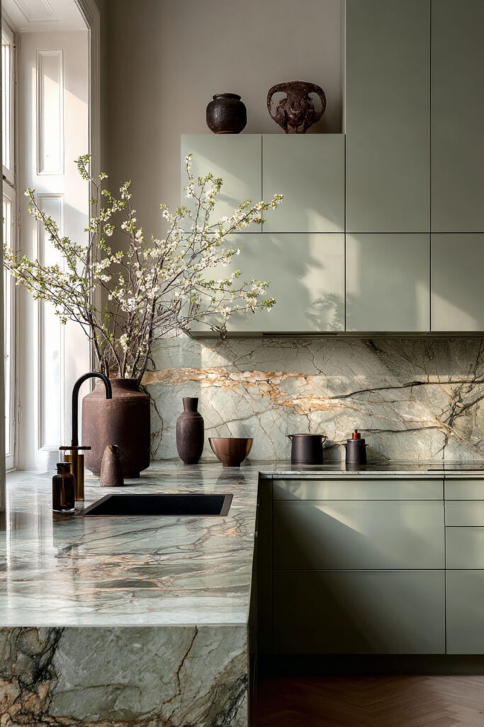I recommend sage green shaker cabinets paired with a green-veined marble countertop and a matching slab backsplash. The marble’s natural green veining picks up the cabinet color, and together they create this envelope of soft green that makes the kitchen feel like being inside a living thing — a garden, a grove, a greenhouse. Kitchen green marble countertops paired with sage cabinets is one of those combinations that feels almost inevitable when you see it done right.
