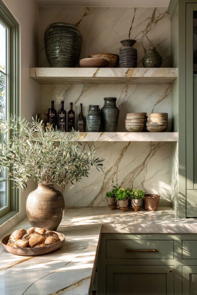 Marble floating shelves are one of those details that immediately communicates “this kitchen was designed with intention.” A single marble shelf — or a pair of them — mounted on a sage green or cream wall is gorgeous, unexpected, and gives you a surface to display your most beautiful pieces. It’s a functional luxury that blurs the line between kitchen and gallery.