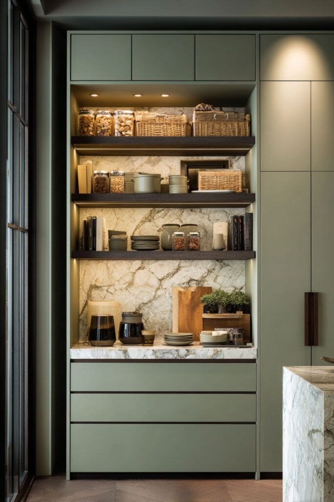 I recommend painting the interior of your pantry in a rich sage green and installing marble slab shelves at different heights. Line the shelves with your glass jars, your oils, your prettiest canned goods. The marble shelves stay cool (which is actually great for food storage), and the sage walls make everything displayed on them look beautiful. It’s a sage green kitchen colour scheme extended into a private, peaceful space that only you see every day — and that makes it feel even more special.