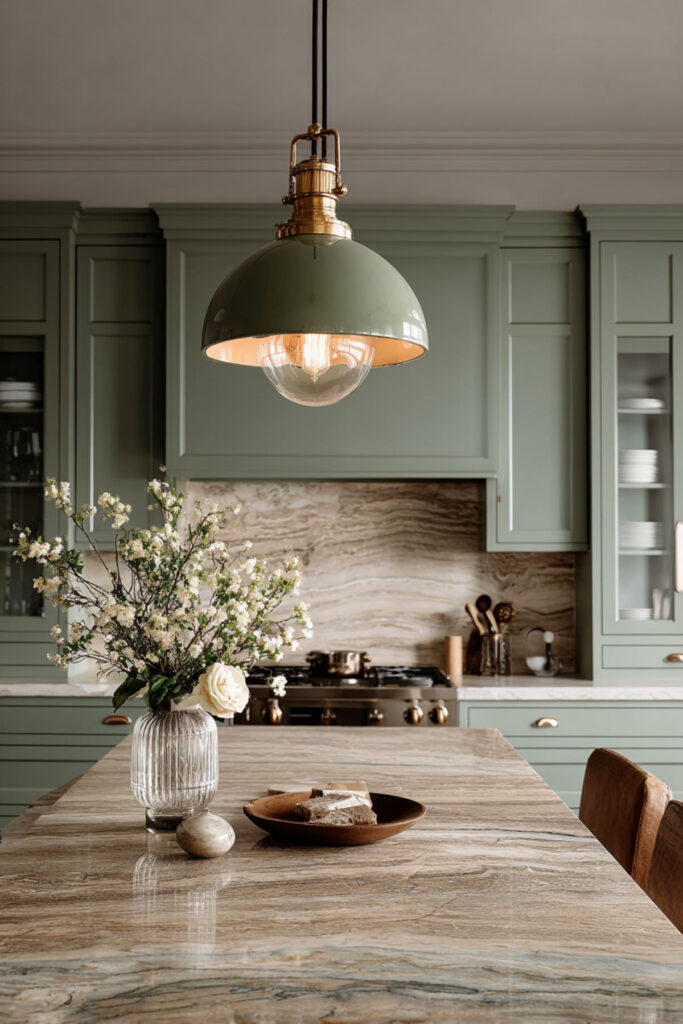 A marble and brass pendant light is one of those fixtures that stops people mid-sentence. The combination of cool stone and warm metal in a single light fixture is inherently striking, and hanging one over a sage green kitchen island ties together every element of this palette in a single piece. The marble echoes the countertop, the brass echoes the hardware, and the sage below ties it all together.