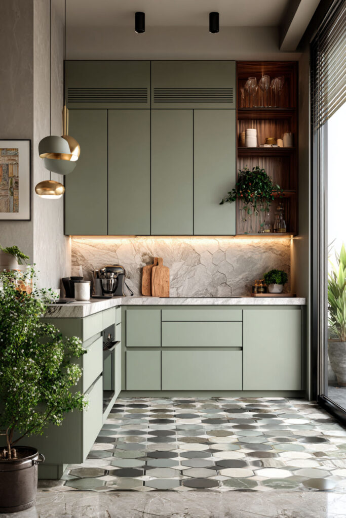 I recommend large-format marble hexagon tiles in a honed finish for the floor, paired with sage green cabinets and a matching marble countertop above. The hexagonal shape adds geometric interest without being busy, and the honed finish prevents the floor from being slippery. It’s the kind of floor that makes walking into the kitchen feel like an event — in the quietest, most beautiful way possible.