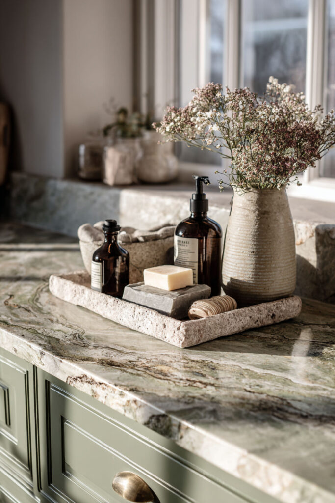 Here’s the simplest, most accessible idea on this list — and one of the most effective. A marble tray on your kitchen counter, holding your daily essentials (olive oil, salt and pepper, a small vase, your favorite hand soap), introduces marble into a sage green kitchen without any renovation at all. The tray creates order, the marble adds texture, and together they turn a cluttered counter into a composed vignette.