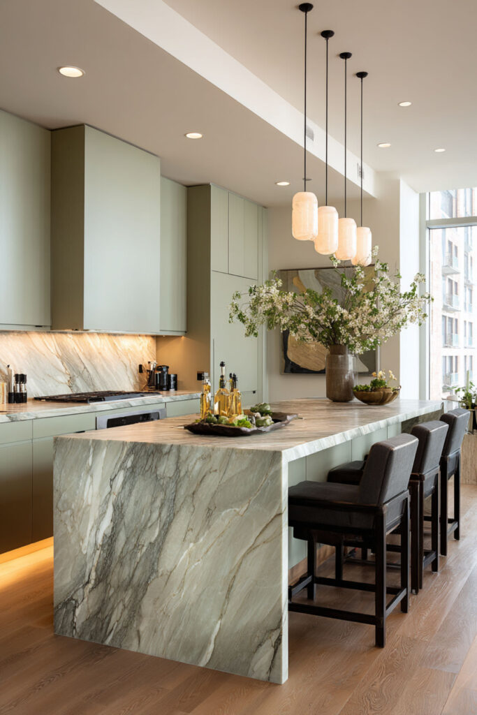 Sage Green Island With a Marble Waterfall Edge