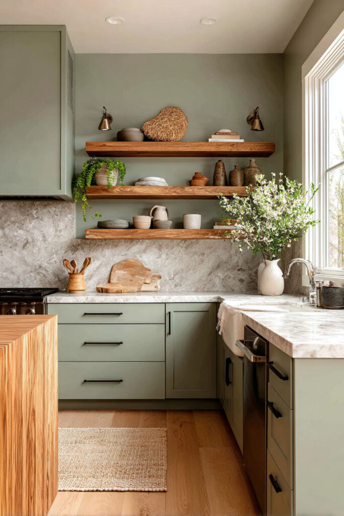 I recommend one or two thick marble floating shelves mounted against a sage green accent wall, between or replacing upper cabinets. Use them for your prettiest ceramics, a few glass jars, a small plant. The cool marble against the warm sage creates a moment of material contrast that’s deeply satisfying. It’s a sage green and cream kitchen detail that takes the room from nice to memorable — and it’s a relatively small investment compared to full marble countertops.