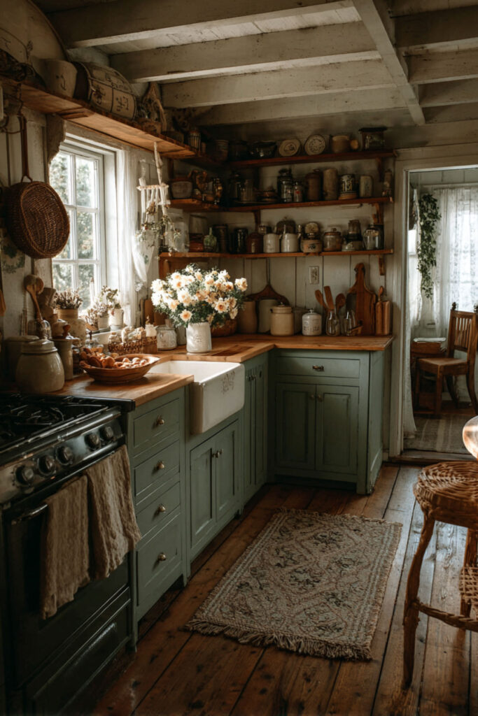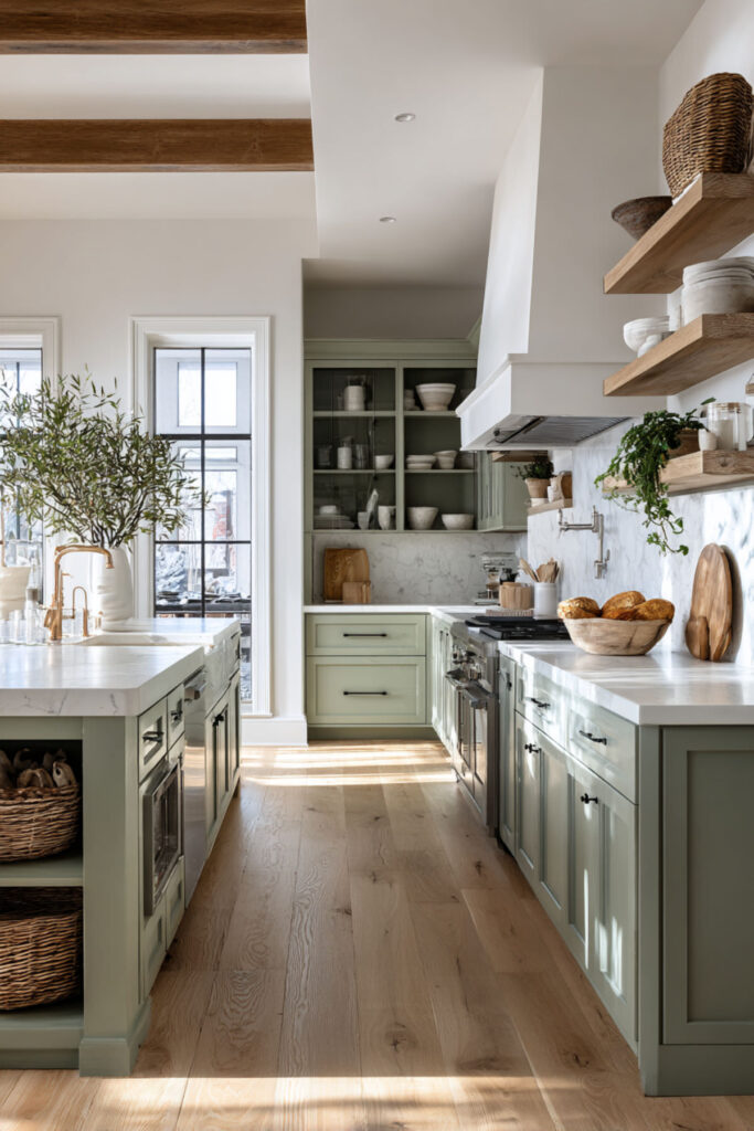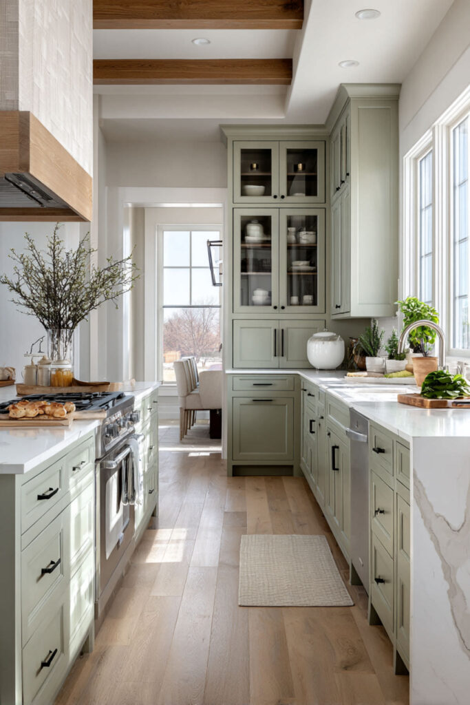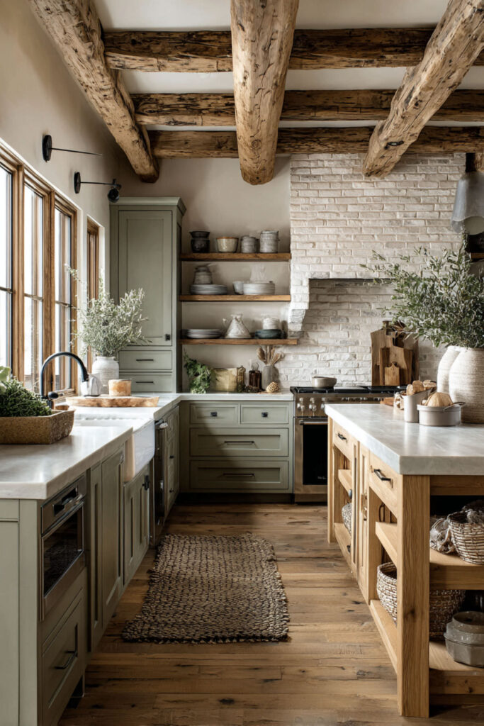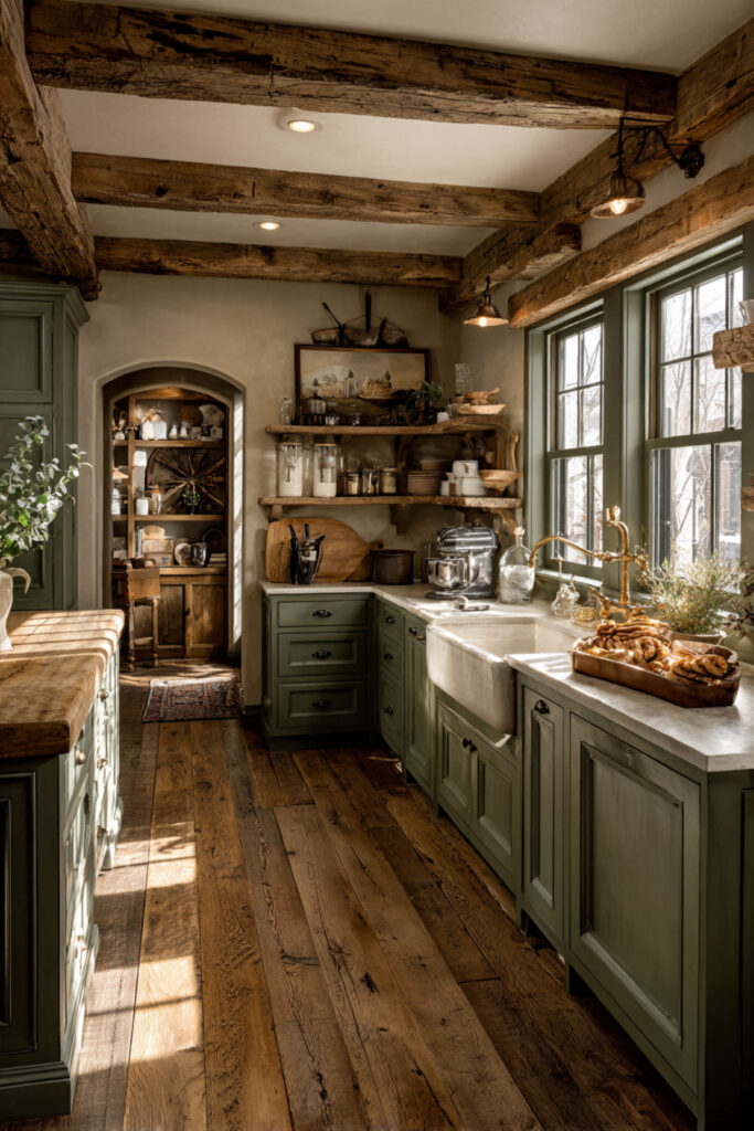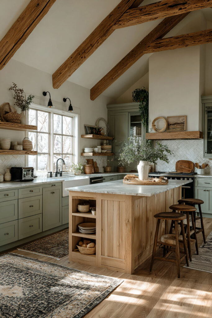 Exposed ceiling beams and sage green cabinets is a combination that grounds a kitchen in the most beautiful way. The beams draw the eye upward and add architectural interest, while the sage cabinets below create a calm, collected base. The contrast between the raw wood overhead and the smooth painted surface below gives the room layers and character. This is what organic design looks like when it’s built into the bones of the house. I recommend leaving the beams as natural as possible — a light stain or clear seal that preserves the wood’s color and texture. Against sage green cabinets, the warmth of the exposed wood makes the whole kitchen feel like a converted barn or a renovated farmhouse in the Hudson Valley — sturdy, warm, and deeply rooted. These rustic green kitchen cabinets with beams create instant character that no amount of styling can replicate.