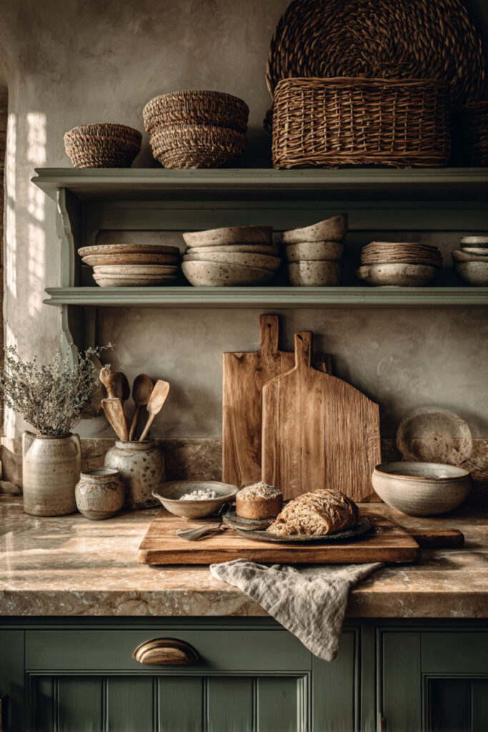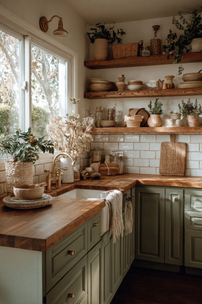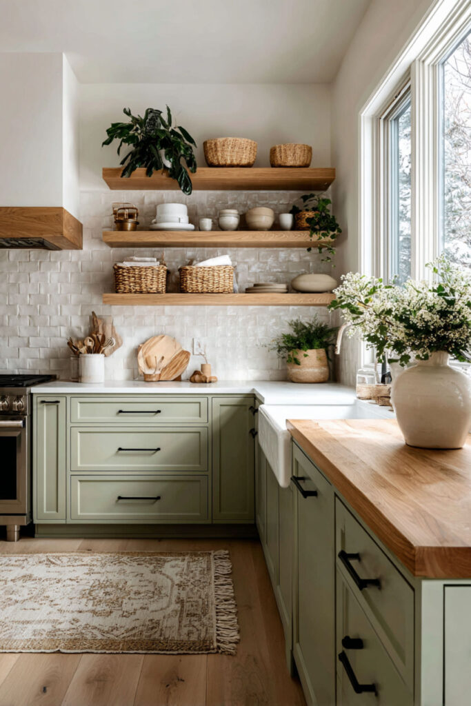 Replacing upper cabinets with open wood shelves is one of the most impactful moves in organic design. Open wood shelves on a sage green kitchen create this beautiful rhythm of painted and natural surfaces, and they invite you to display the things you actually love — stoneware bowls, wooden boards, ceramic crocks, a few glass jars filled with dried goods. The kitchen starts to feel less like a room of closed storage and more like a living, breathing space. I recommend natural oak floating shelves with simple black iron brackets. Style them in groups of three: a stack of plates, a small plant, a cookbook propped upright. Keep breathing room between the items — the negative space is part of the design. This open shelving approach paired with sage green lowers is the kind of kitchen that makes you slow down and appreciate the little things.