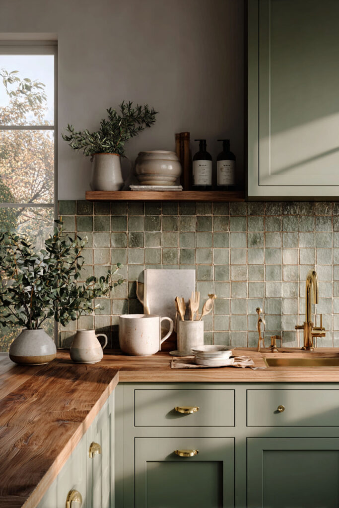 Using sage green in the backsplash instead of (or in addition to) the cabinets adds a layer of texture that paint alone can’t achieve. Sage green kitchen tiles — handmade zellige, subway, or small-format square tiles — behind a wood countertop create this gorgeous interplay between the glazed surface and the raw grain. The tile catches light, the wood absorbs it, and together they produce a visual depth that makes the kitchen feel alive. I recommend handmade zellige tiles in a soft sage. The slight variation in each tile’s color and texture gives the backsplash a living quality that flat paint can’t match. Paired with a maple or oak butcher block counter below, the effect is organic, textured, and genuinely beautiful. This green backsplash with wood counter pairing is one of the most pinnable ideas in the organic kitchen space.