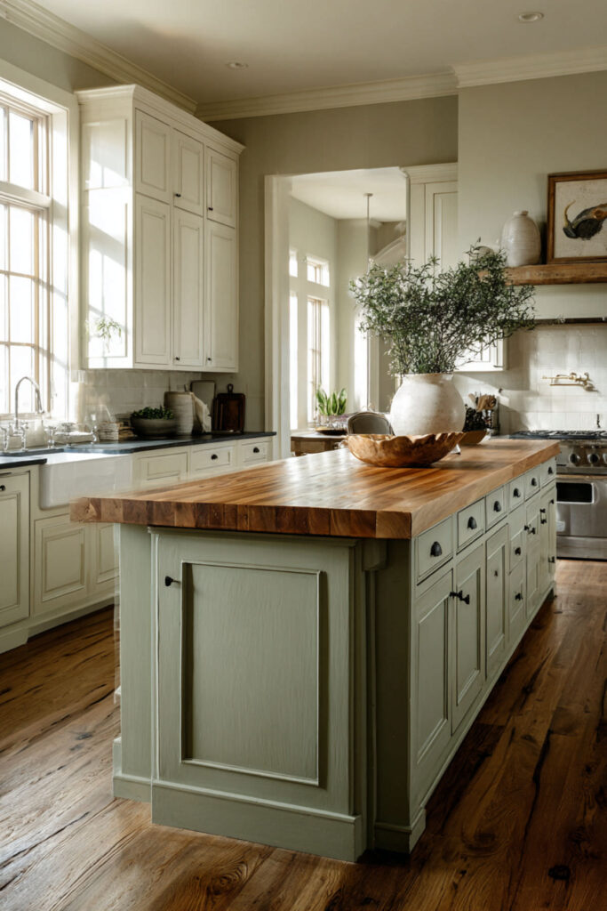 The island is the natural center of any kitchen, and when it’s sage green with a live-edge or thick-cut wood top, it becomes a piece of organic sculpture. A green kitchen island with a wood countertop turns the most functional surface in the room into the most beautiful one. The combination of the painted base and the raw top creates this dialogue between the made and the natural that defines organic design. I recommend a live-edge walnut or oak slab for the island top if your budget allows — the natural edge becomes a design element in itself, and no two slabs are alike. If live-edge feels too rustic, a thick-cut standard butcher block achieves the same warmth with cleaner lines. Either way, the sage base with the wood top is a showstopper.