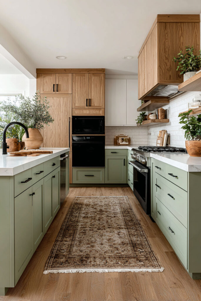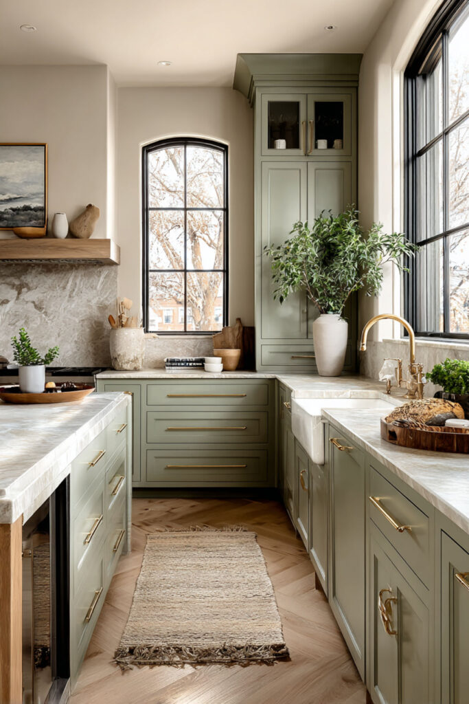 Oak and sage and brass is the organic design trifecta. The sage provides the calm, the oak provides the warmth, and the brass provides the glow. A sage green and oak kitchen with brass hardware creates a palette that feels like golden hour captured in a room — warm, soft, and endlessly flattering. Every surface catches light differently, and the result is a kitchen with real depth and dimension. I recommend unlacquered brass hardware throughout — the patina it develops over time is part of the organic design philosophy. Things that change, that age, that show the marks of use — that’s the whole idea. Pair with a white quartz or marble counter to give the eye a resting place amid the warmth, and this sage green and oak kitchen becomes the kind of room people never want to leave.