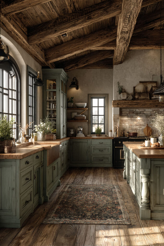 Rustic Green Kitchen Cabinets With Exposed Beams