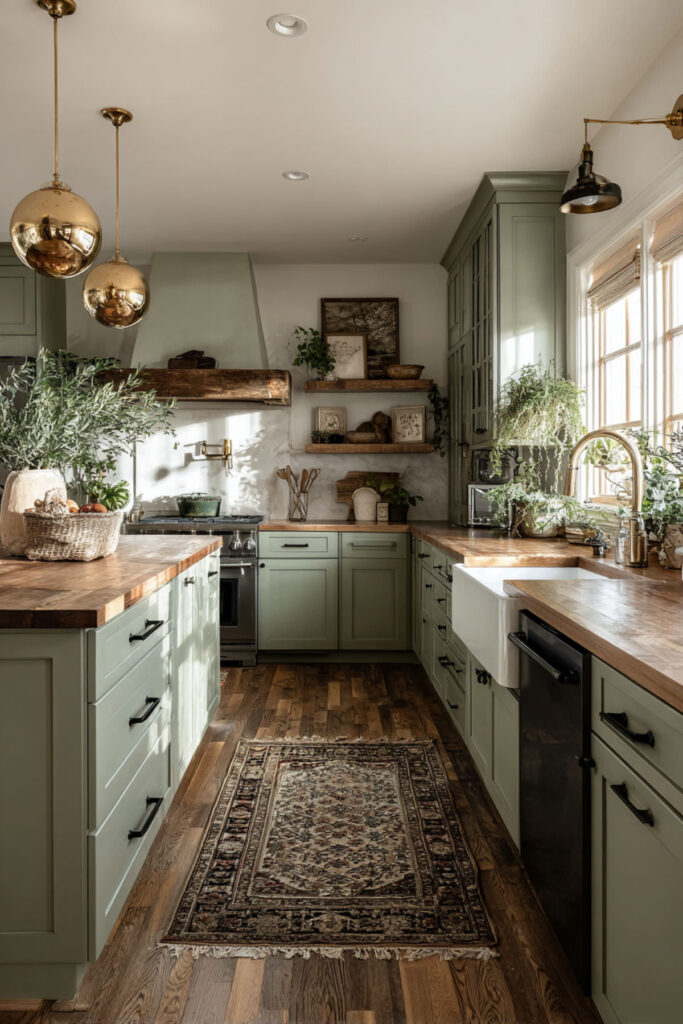 Sage Green and Oak Kitchen With Brass Hardware