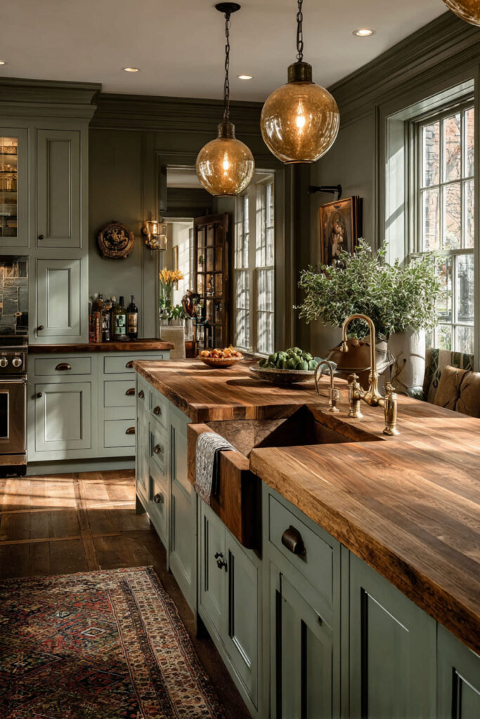 Sage Green Kitchen With Butcher Block Countertops