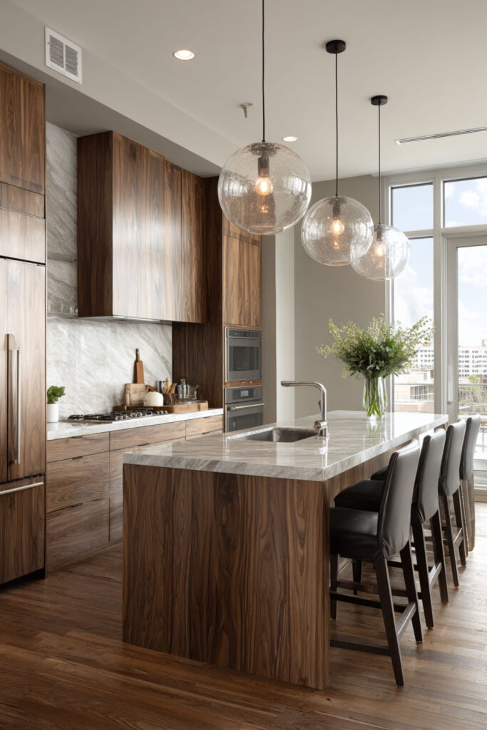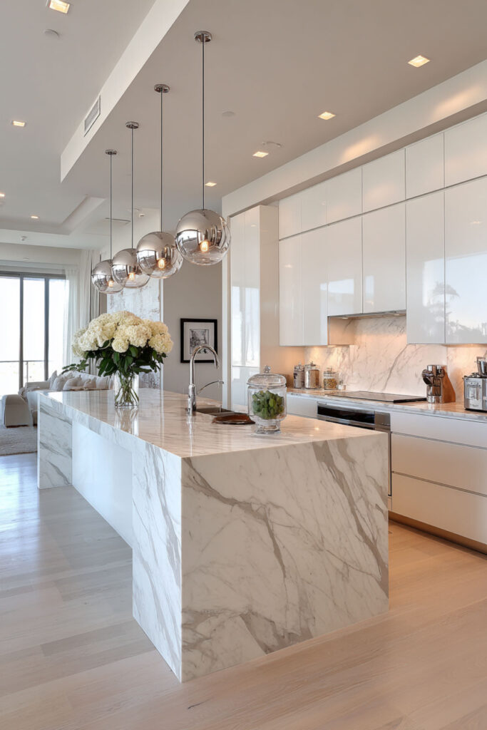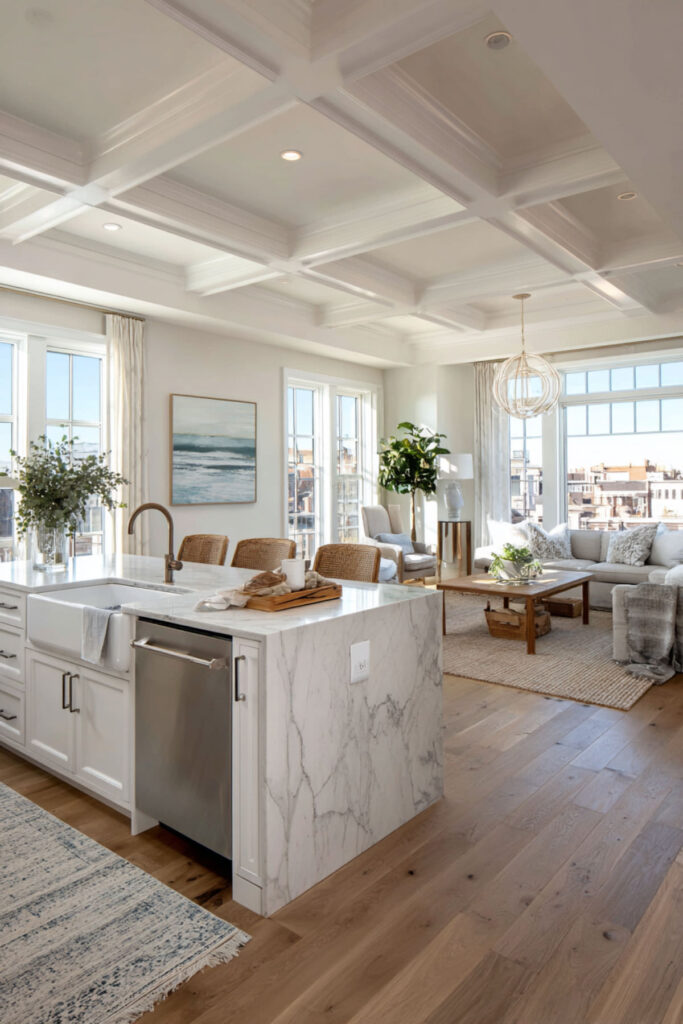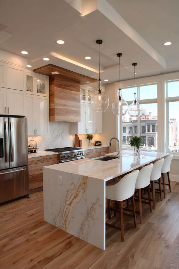 The peninsula can hold a single bar stool for morning coffee, not a row of seats you’ll never fill. This partial division maintains openness while defining the kitchen zone. I really recommend this type of waterfall edge peninsula that looks sculptural while hiding storage.