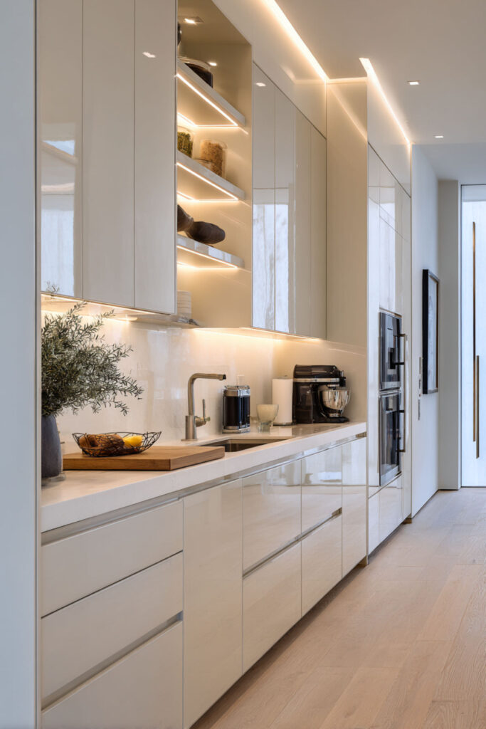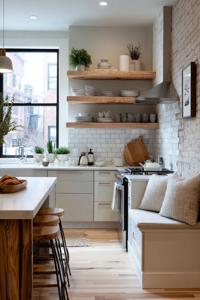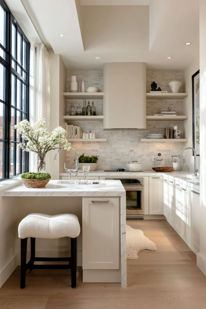 The remaining room becomes flexible space for a comfortable chair, a small table, or simply openness. This layout proves that smaller, simpler spaces often feel more luxurious than complicated kitchens. I really recommend these hidden-mount shelves that appear to float, maintaining visual lightness.