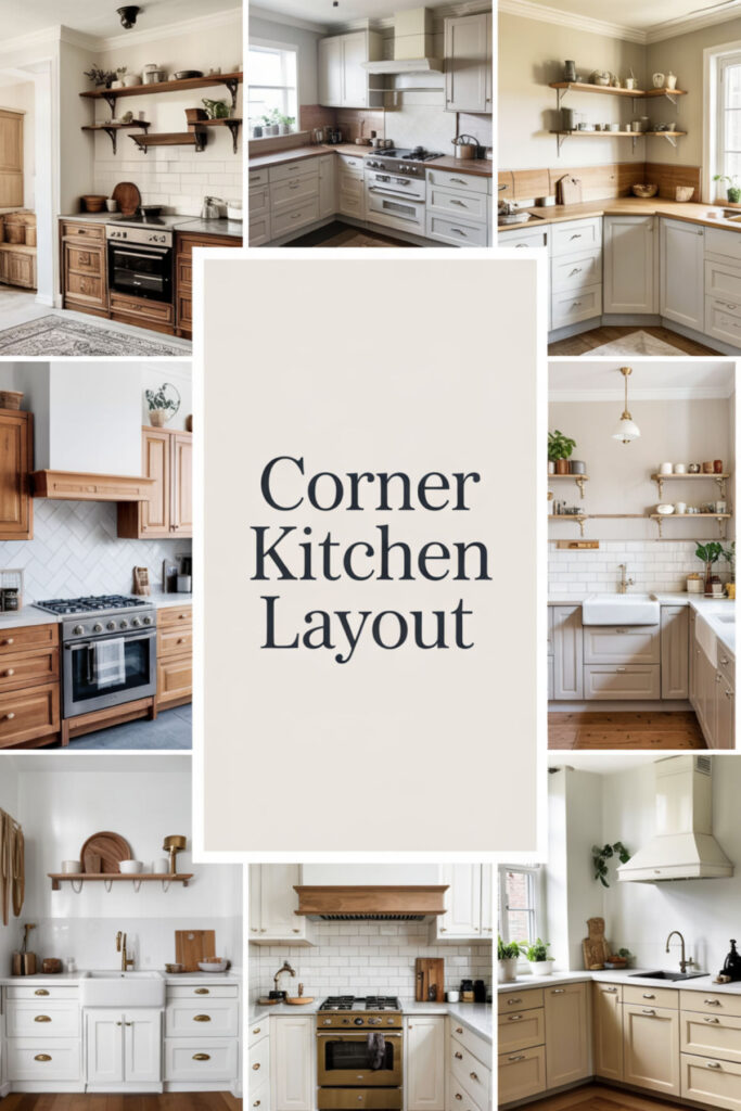 Transform that corner kitchen layout from cramped to calm by simplifying rather than maximizing. Instead of complex corner storage systems, leave corners open or use them for a single beautiful object. The dead space becomes breathing room. Simple open shelves at the corner junction for daily dishes, nothing more. This approach fights the urge to fill every inch with storage.