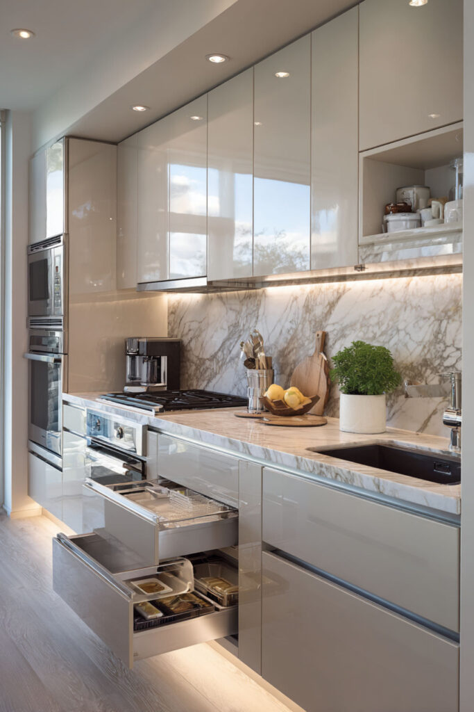 A minimalist layout doesn’t mean living without – it means living without visible chaos. Invest in full-overlay cabinets that hide everything behind clean faces. Install internal drawer organizers so items have designated homes. The counters stay bare except for one or two beautiful objects that bring joy.