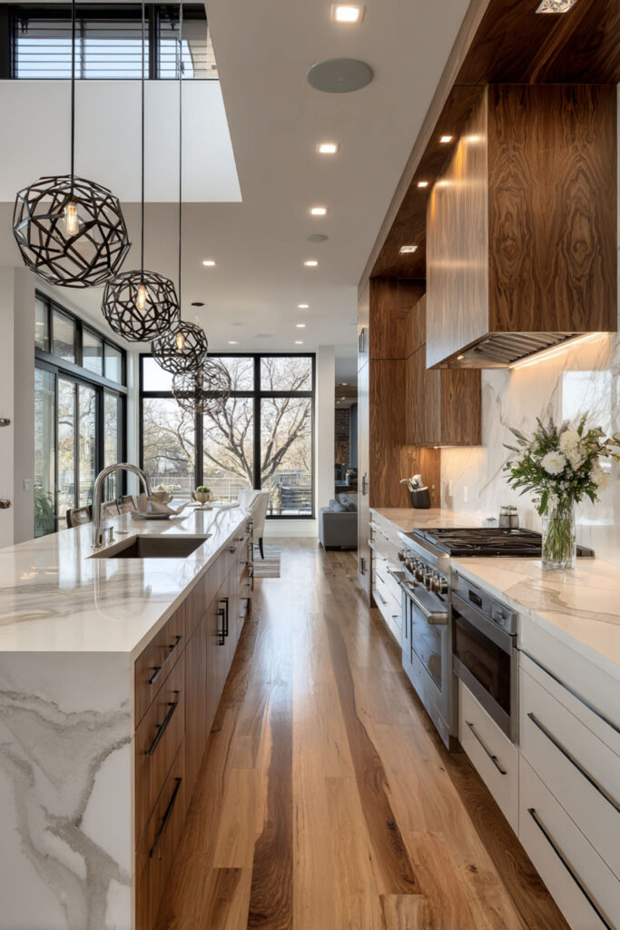 A rectangle kitchen layout provides linear calm through straightforward geometry. No angles to navigate, no corners to manage, just clean lines and clear flow. Arrange elements symmetrically for visual balance.