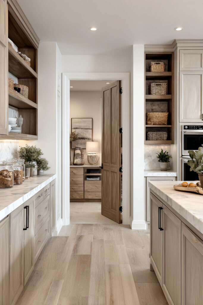 A kitchen with pantry layout allows abundance without visible clutter. The pantry holds backup supplies, seasonal items, and bulk purchases. The kitchen proper stays minimal and calm. Glass pantry doors if you keep it organized, solid if you don’t.