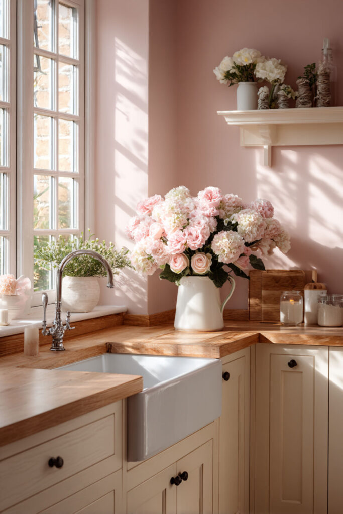 I recommend a matte soft pink paint on the wall behind the sink, with the rest of the kitchen in white or warm cream. The pink should be subtle — barely there in some lights, warmly present in others. Against white cabinets and a brass faucet, the single pink wall adds the softest layer of color. It’s a pink kitchen aesthetic you can achieve in an afternoon with a quart of paint and a roller. One wall. One color. One completely different feeling.