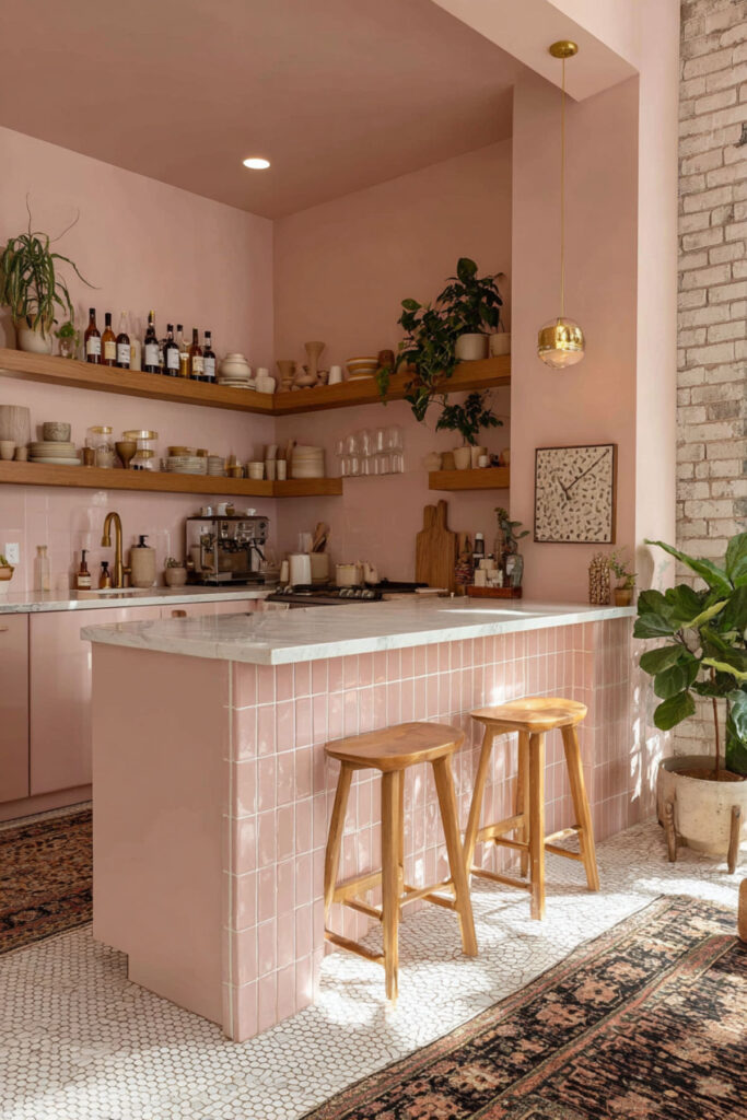 I recommend blush pink kitchen cabinets or walls with natural wood floating shelves, a wood island top, or wood bar stools. The wood should be warm-toned (honey oak, light walnut, natural maple) rather than cool or dark. The combination makes the kitchen feel organic and collected — like a room that grew together over time. Blush pink kitchen with wood is one of those pairings that sounds unusual but looks completely right the moment you see it.