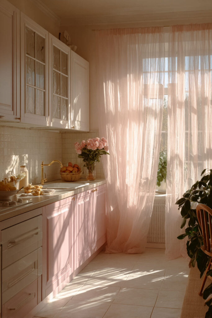 Sheer linen curtains in a pastel pink kitchen are one of the most beautiful ways to enhance natural light while adding softness and privacy. The linen filters the light gently — diffusing harsh rays and turning direct sun into a soft, even glow that fills the room. In a pink kitchen, the filtered light takes on a warm, rosy quality that makes everything look more flattering. Yes, including you. That matters at 7 a.m.