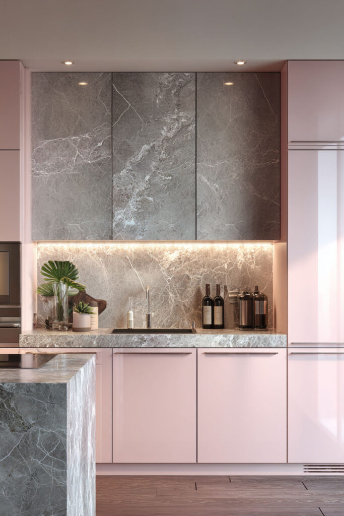 Some people think pink needs to be paired with white. I think it looks even better with soft gray. A gray marble backsplash behind dusty pink kitchen cabinets creates a combination that’s sophisticated and modern — the gray cools the pink just enough to keep it from reading as sweet, and the pink warms the gray just enough to keep it from feeling cold. It’s a pink and gray kitchen ideas approach that feels grown-up and grounded while still being genuinely feminine.