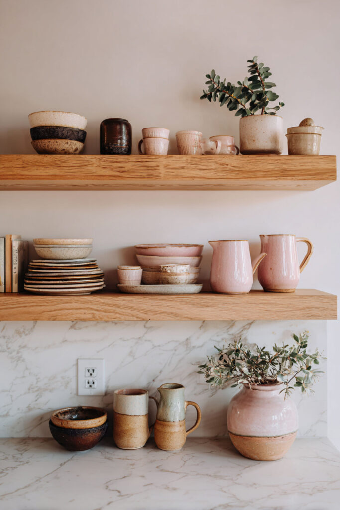 Cream open shelving against pale pink cabinets (or a pale pink wall) creates a soft, tonal combination that’s warm and cohesive without any contrast at all. The cream and the pink are close enough in tone that they read as one warm family, but different enough that the shelves stand out just slightly as their own element. It’s two shades of gentle warmth layered together, holding your most beautiful everyday items.
