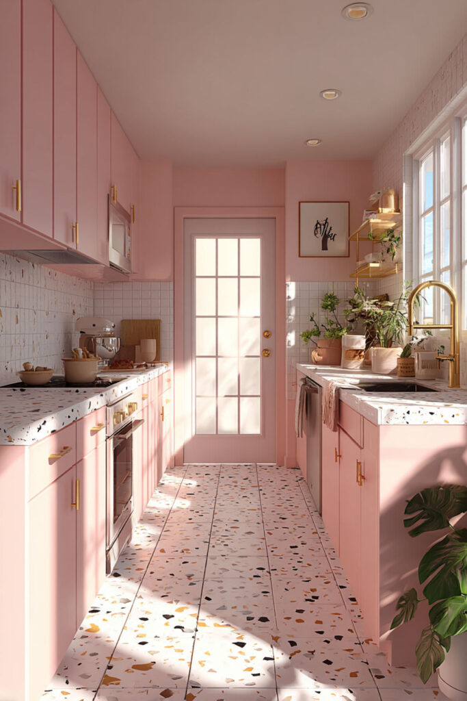 Aesthetic Pink Kitchen With Terrazzo Flooring