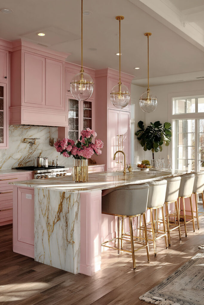 I recommend light pink kitchen cabinets with a white Calacatta or Carrara marble countertop — look for marble with warm veining that echoes the pink’s undertone. The combination feels inherently luxurious without being formal. Add brass hardware and a warm wood cutting board propped against the backsplash, and the corner reads as curated and calm. Pink and marble kitchen done in a way that feels like a permanent exhale.