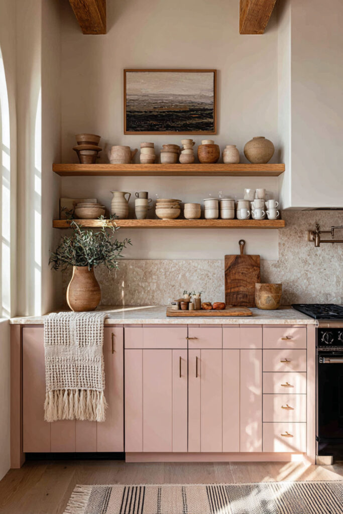 I recommend cream-painted floating shelves mounted on a pale pink wall, styled with white plates, glass jars, and one or two pink accent pieces. The cream and pink blend seamlessly, and the objects on the shelves pop just enough to be noticed without demanding attention. Pale pink kitchen cabinets with cream shelving — a combination so quiet it almost whispers. And in a calm, light-filled kitchen, a whisper is exactly loud enough.