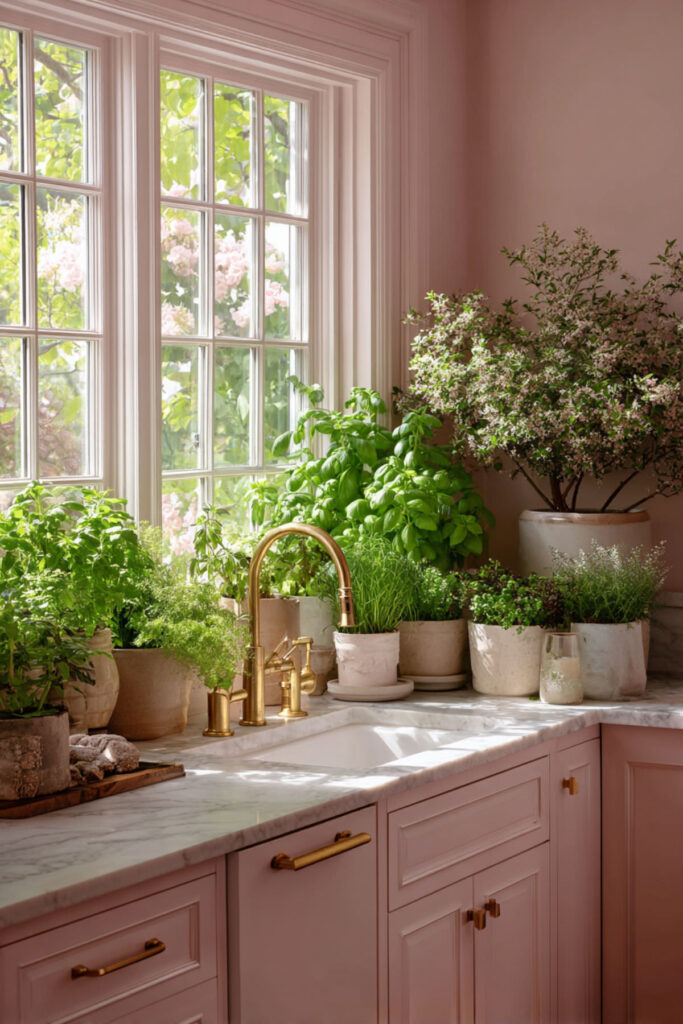 A few small herb pots on the windowsill of a pink kitchen create one of the most charming, light-filled moments in the room. The green of the herbs against the soft pink walls is a natural color pairing — blush and green exist together in nature (think roses, peonies, spring gardens), and in a kitchen, the combination feels organic and alive. The herbs catch the best light in the room, and the pink around them makes the green look even more vivid.